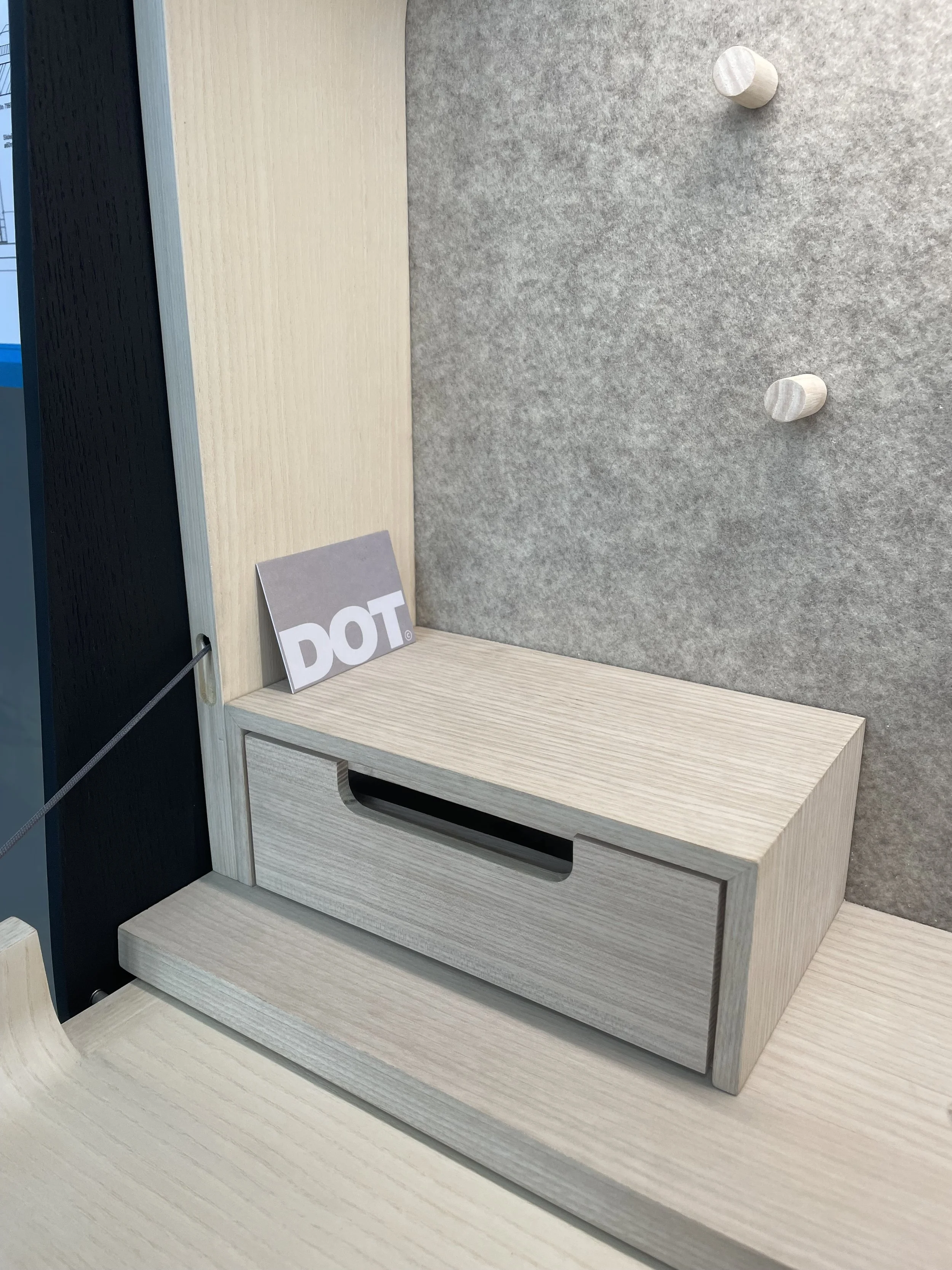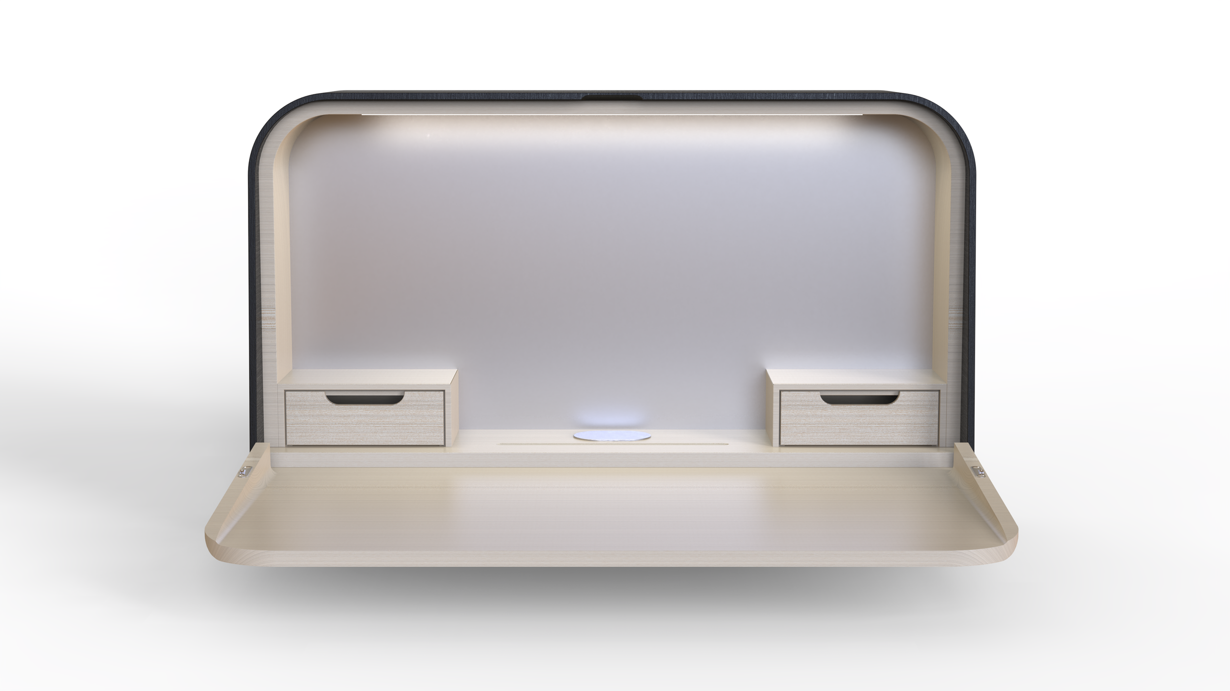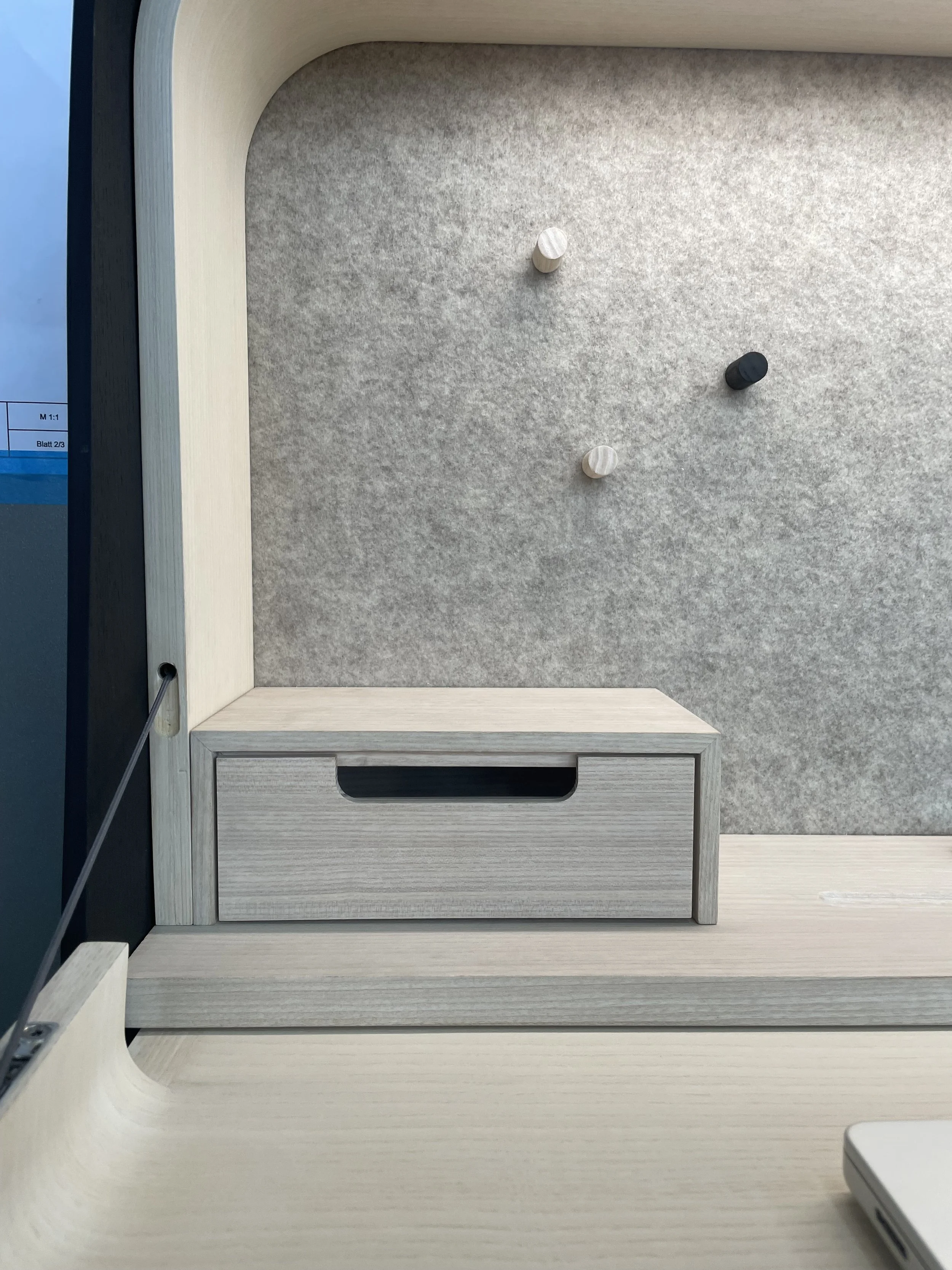 hydraulic cable flap holder for smooth opening | dimmable led- light via pushbutton | magnetic back panel | acoustic felt “BuzziFelt” on the back wall for sound absorption | inductive charging embedded above the right drawer | power connections (schuko, usb) via “Slidebox” | milled groove as tablet or laptop stand