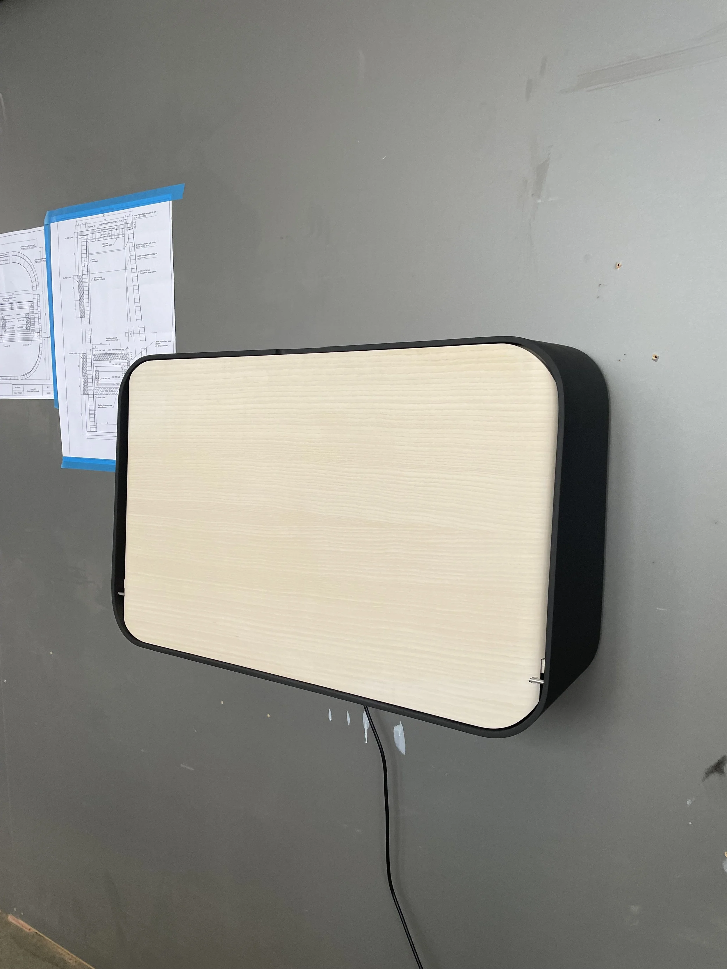 shaped glued ash wood | stained black and painted with natural wood effect varnish