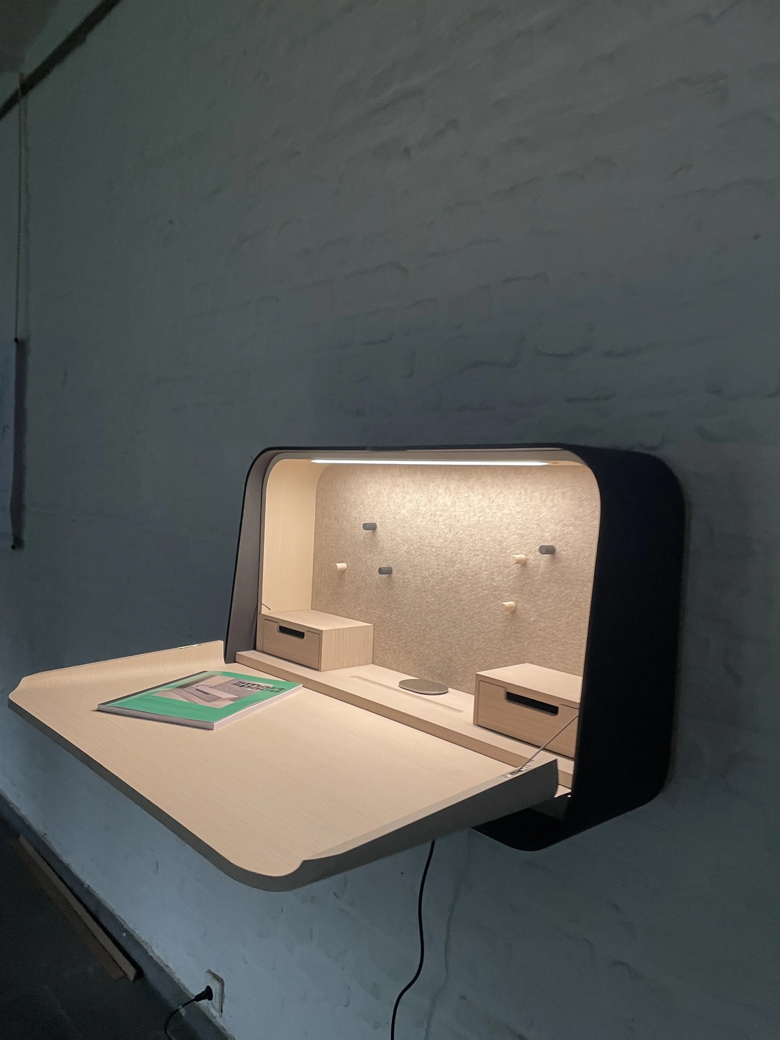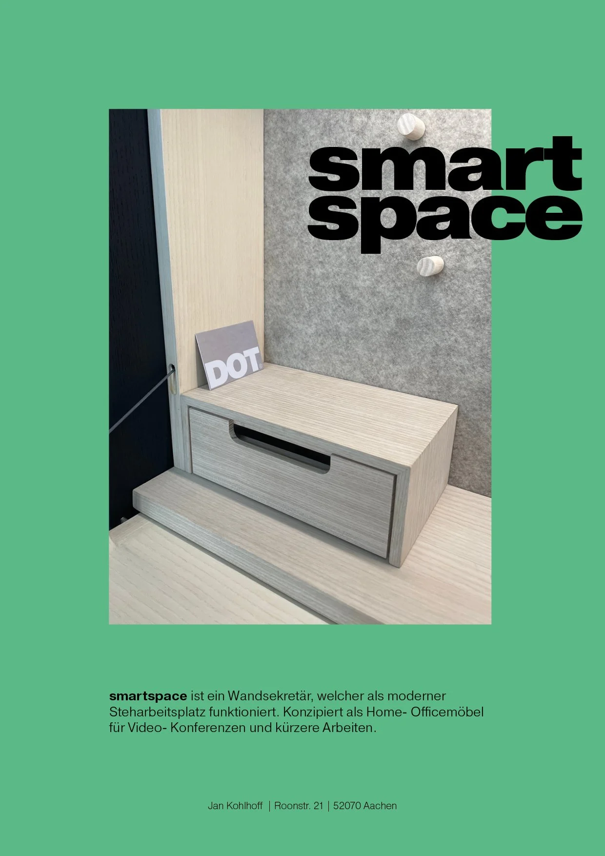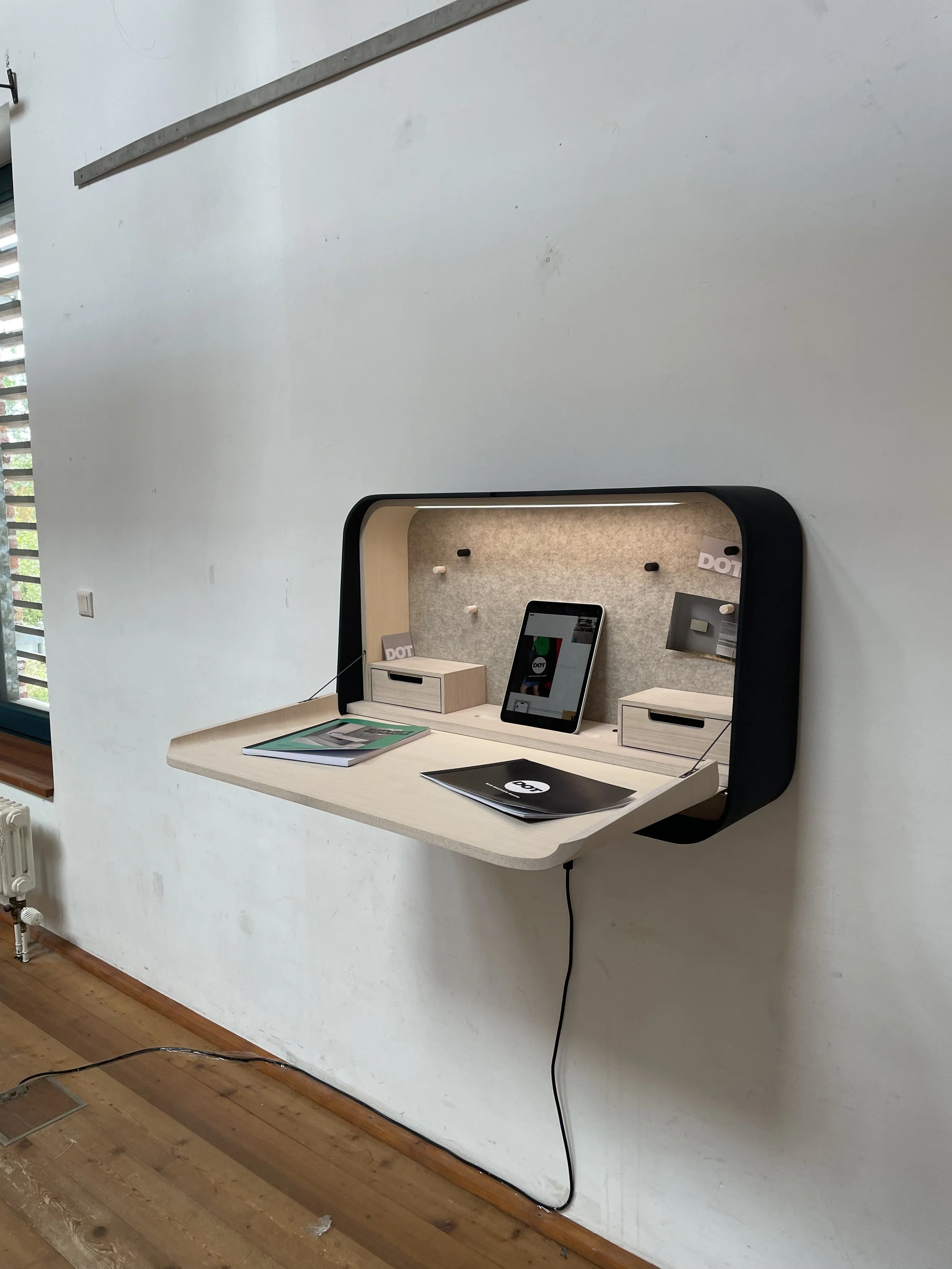 smartspace is a wall-mounted desk that functions as a modern standing workstation. Designed as home office furniture for video conferences and shorter work sessions, the aim is to promote health and increase performance. Ideal for small spaces.