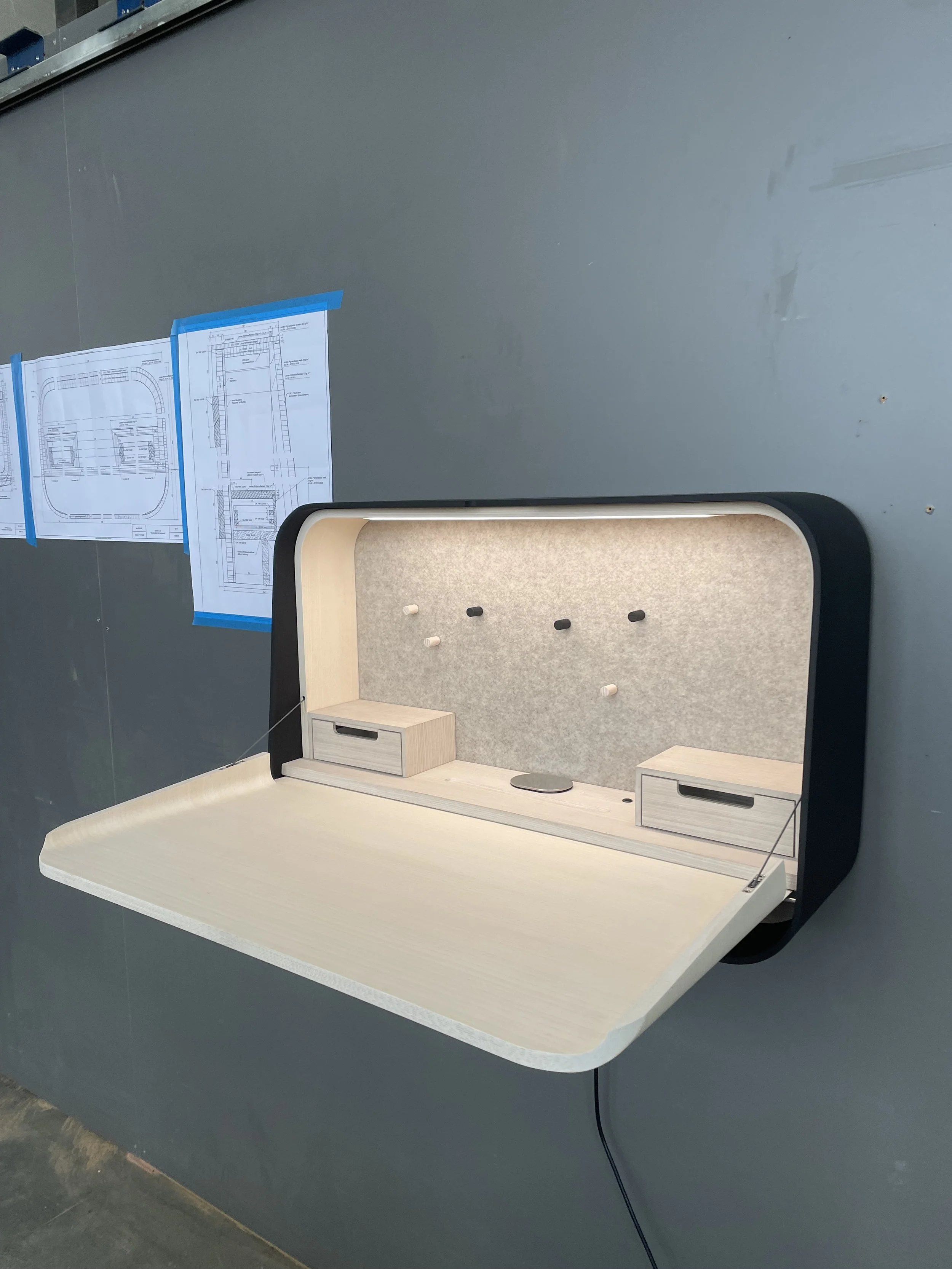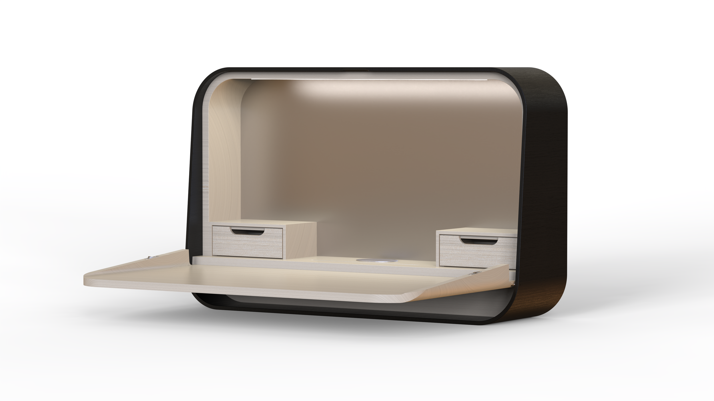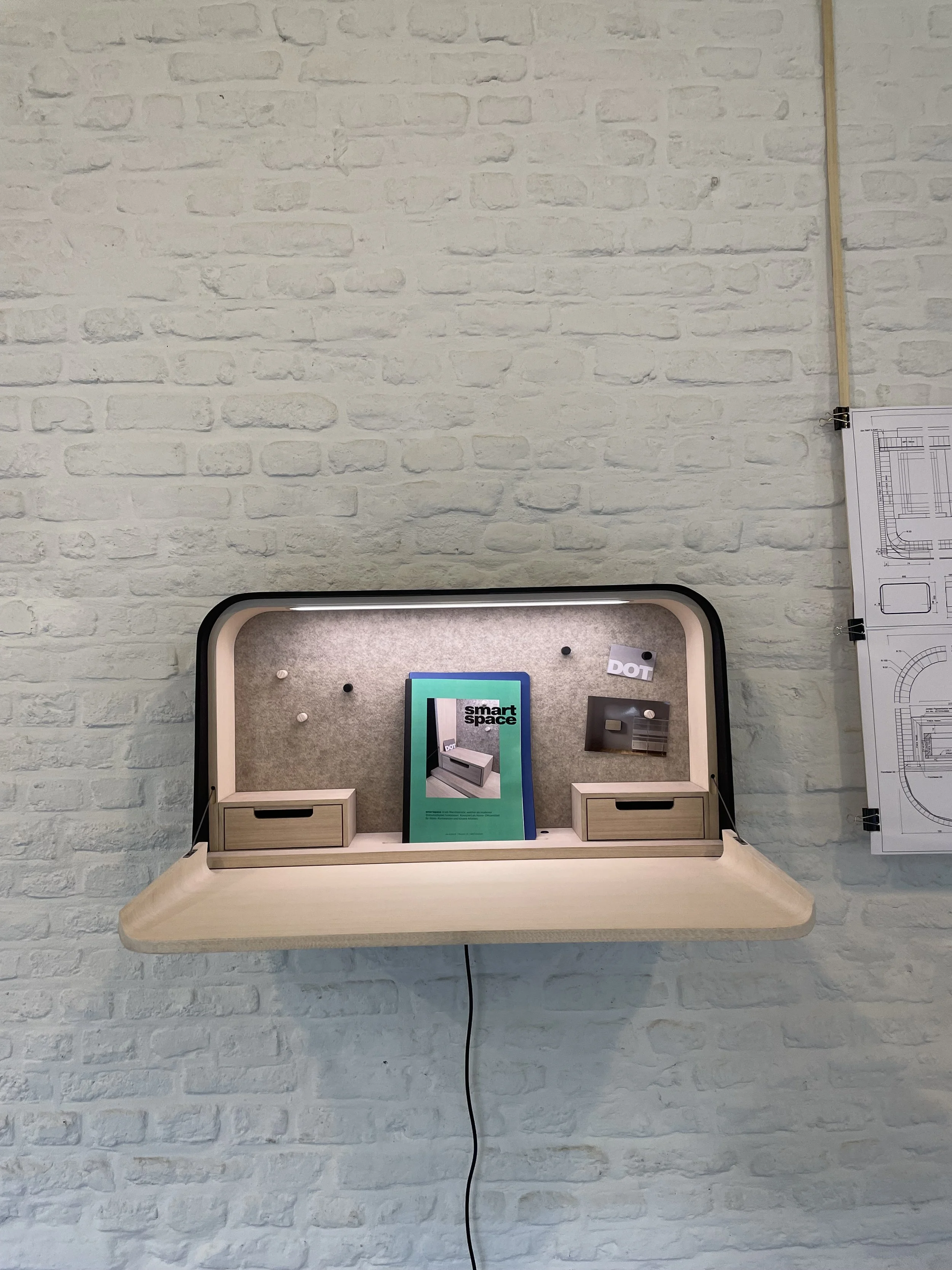 smartspace is a wall-mounted desk that functions as a modern standing workstation. Designed as home office furniture for video conferences and shorter work sessions, the aim is to promote health and increase performance. Ideal for small spaces.