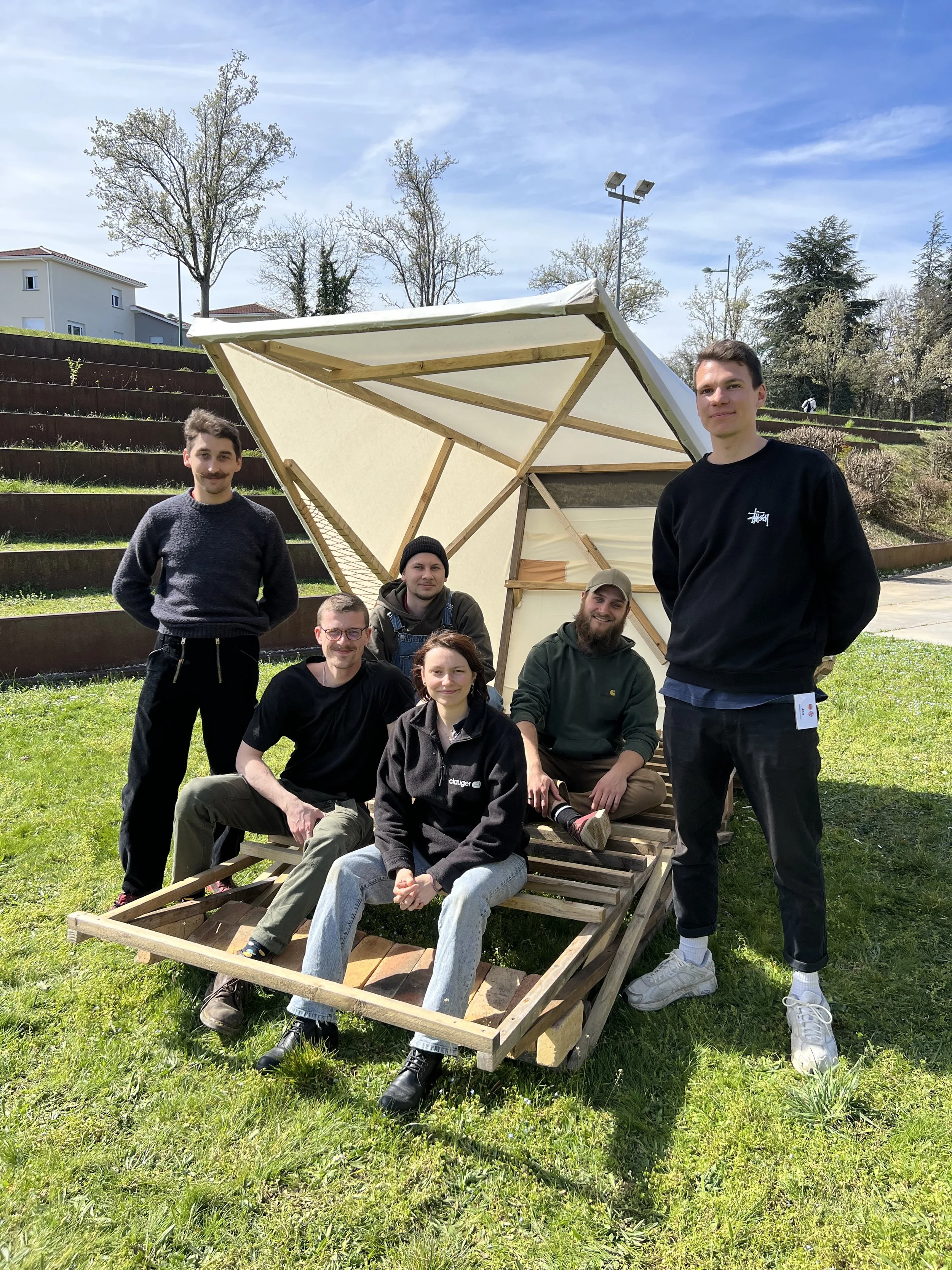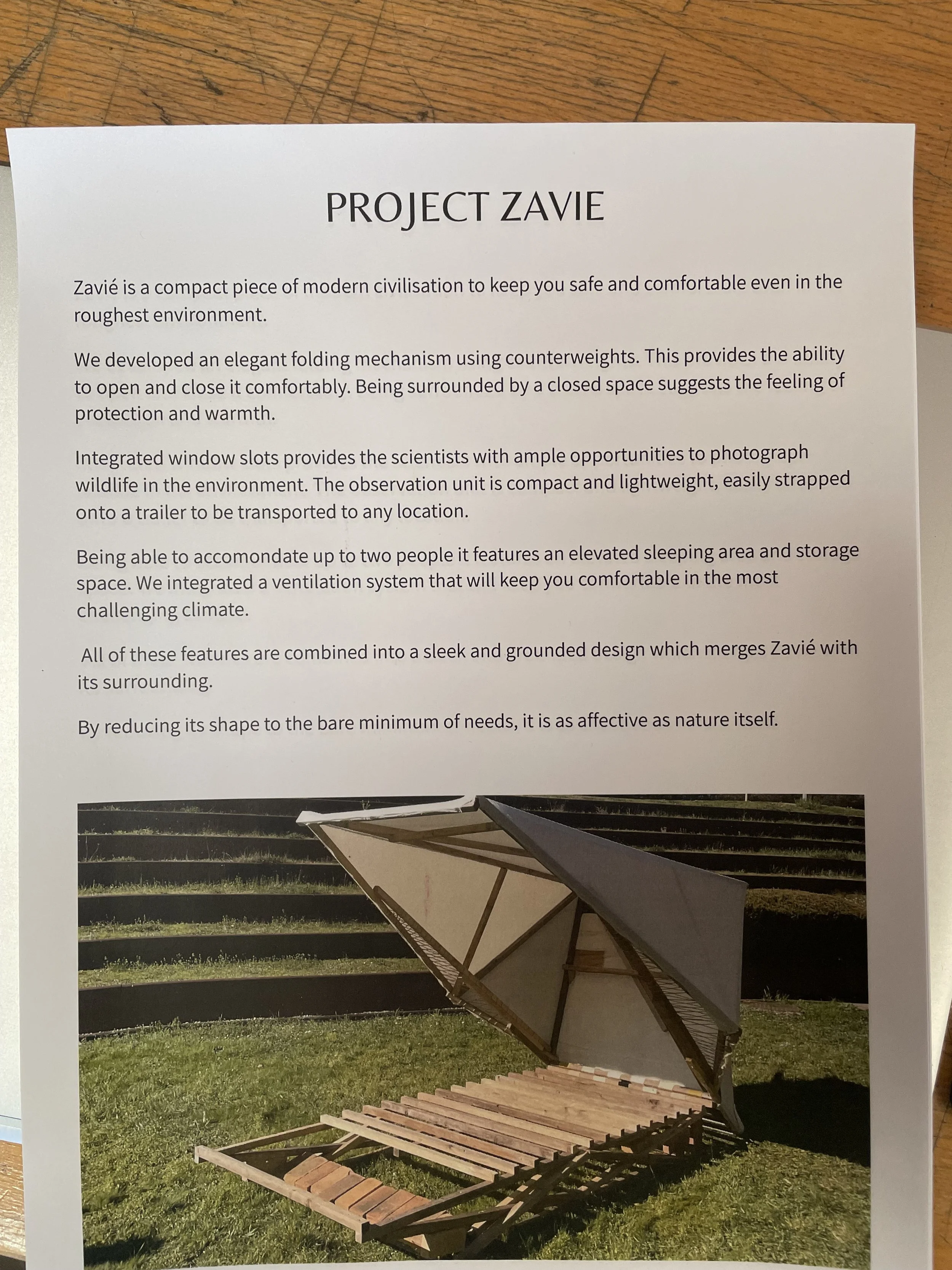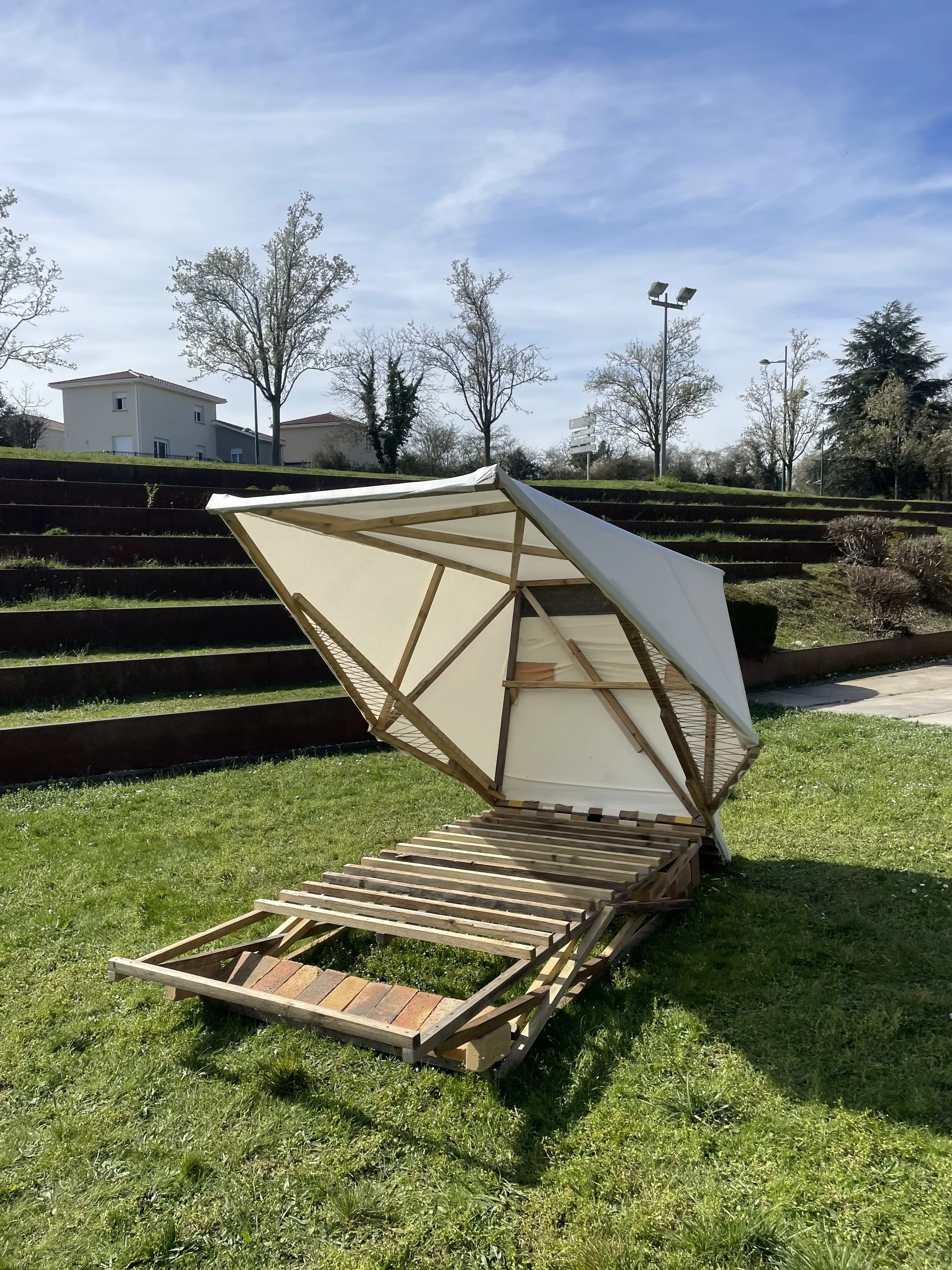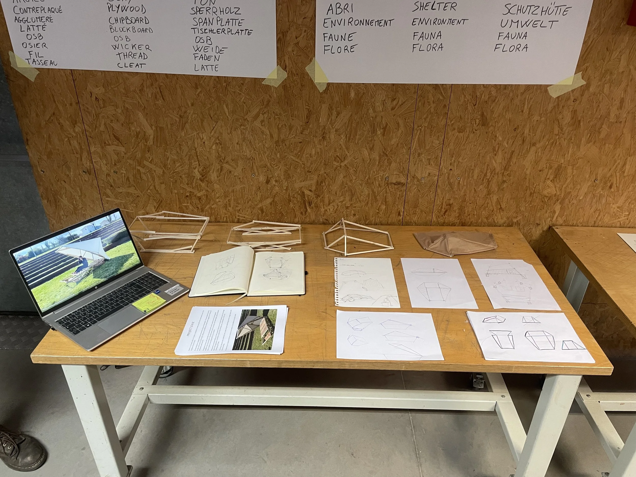 The zavie project was created during a one-week international exchange with the “Compagnos du Devoir” near Lyon, France. The task was to construct an observation station for ornithologists in the Nevada desert. The challenge arose from the limited materials to be used: bricks, squared timber, a little cloth, string and screws.